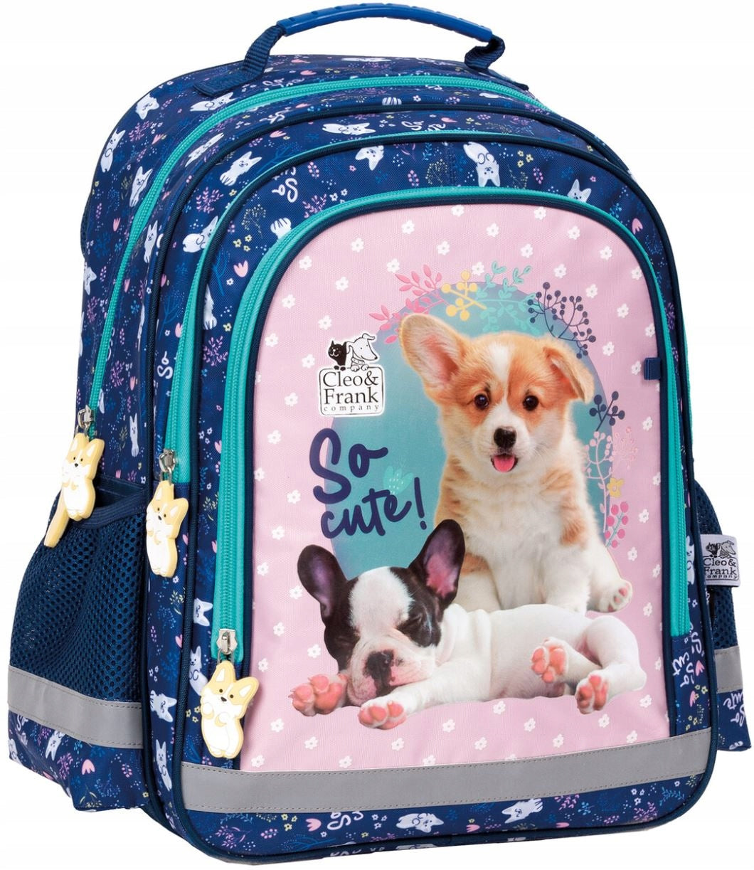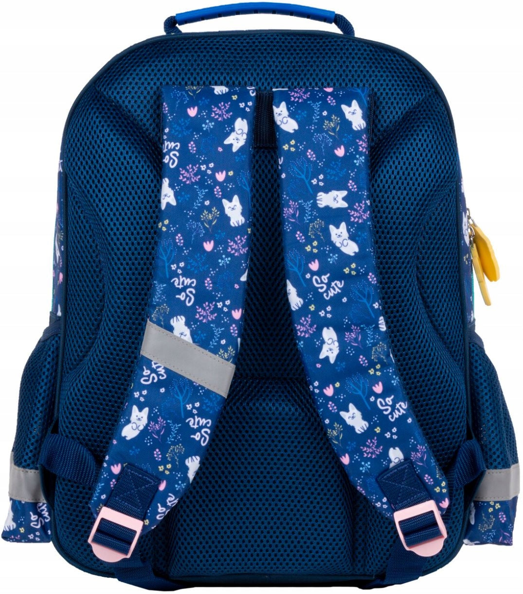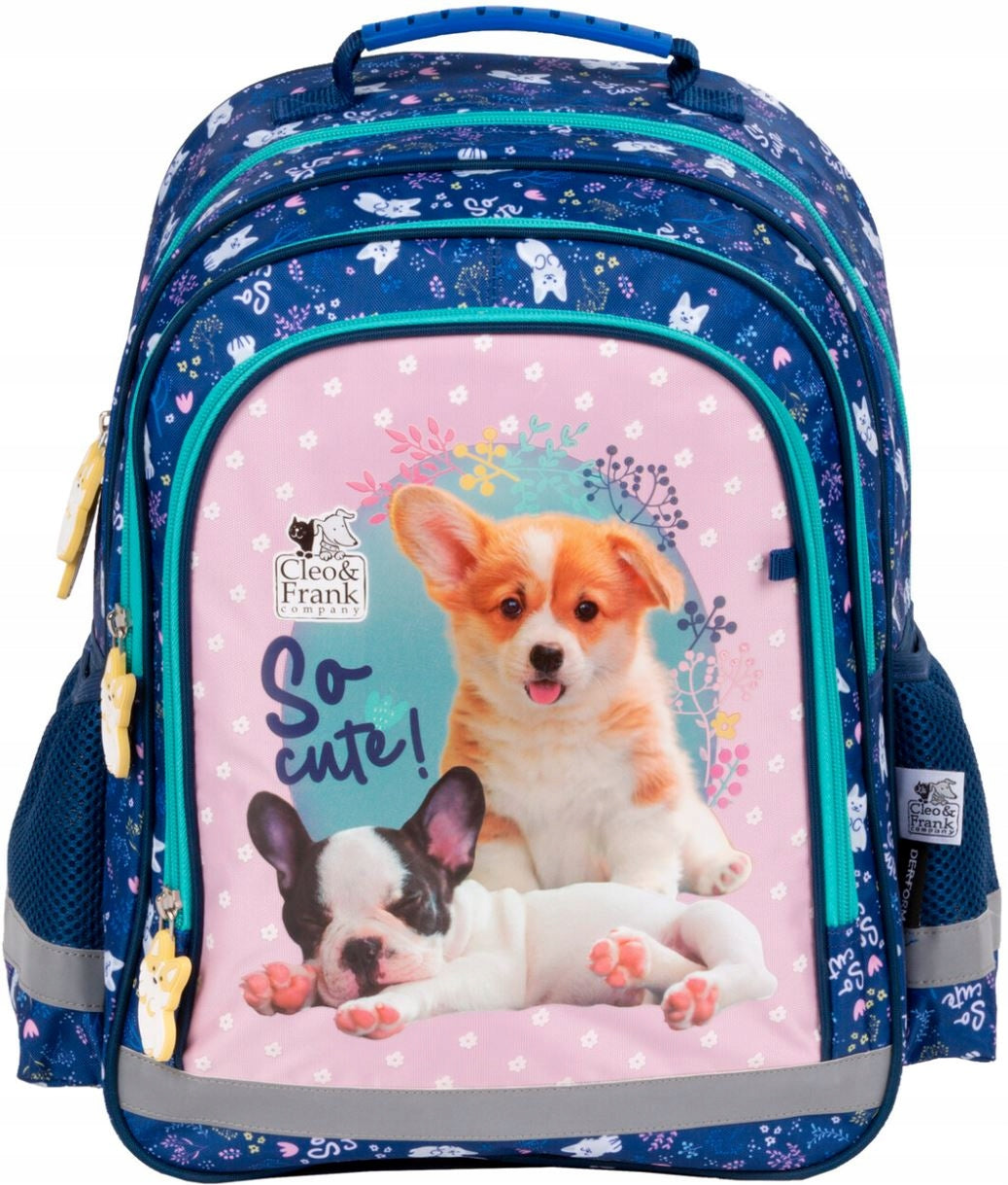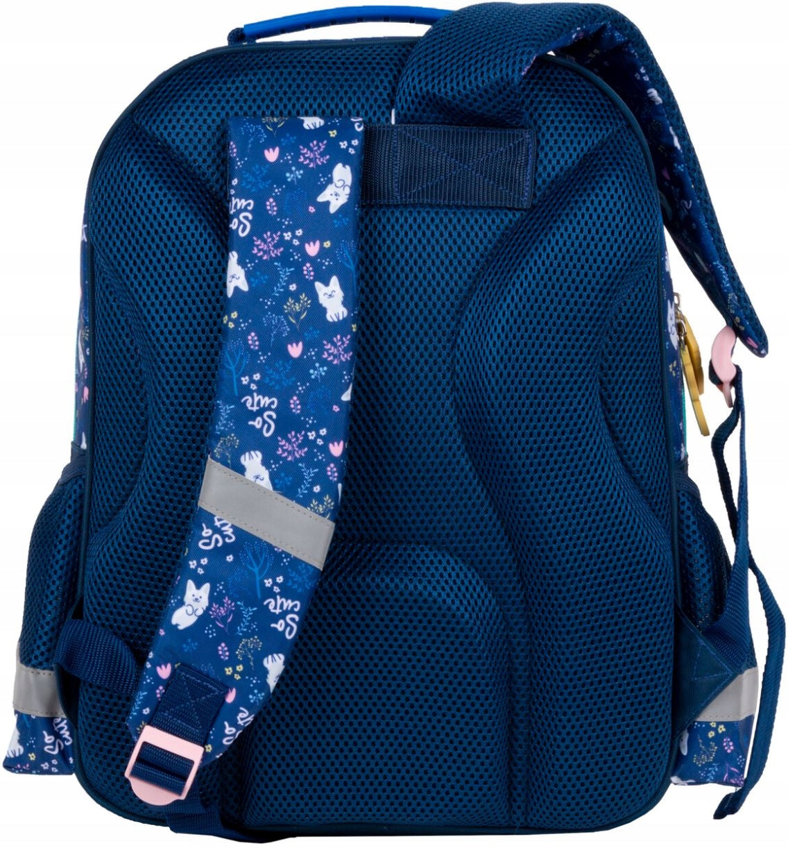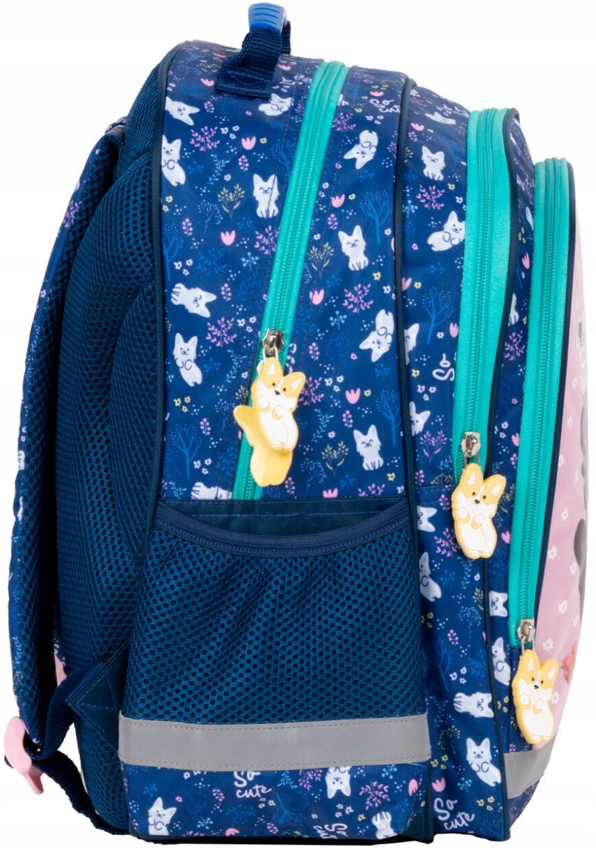 Dviejų skyrių mokyklinė kuprinė su erdvia priekine kišene. Dvi šoninės kišenės su tinkleliu.