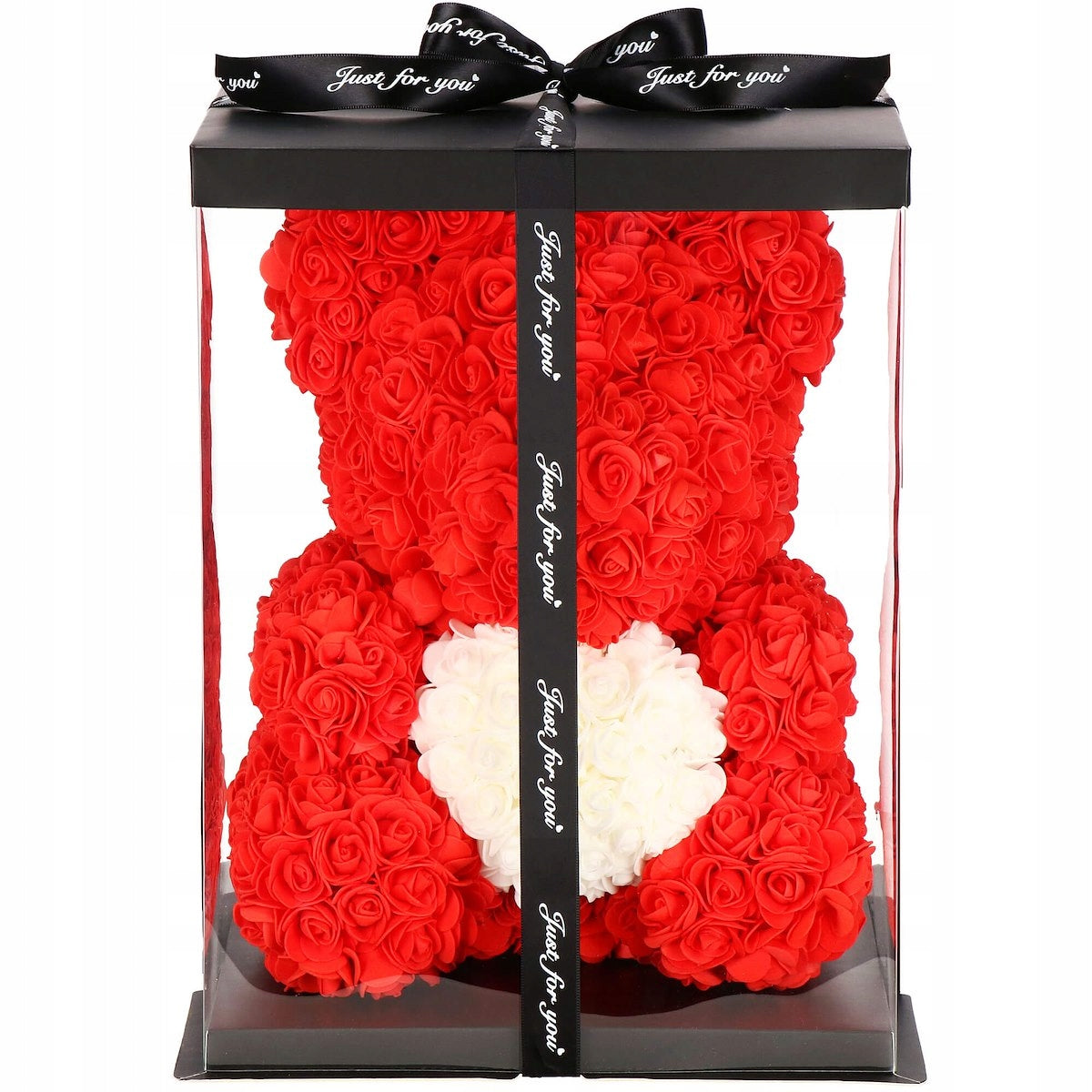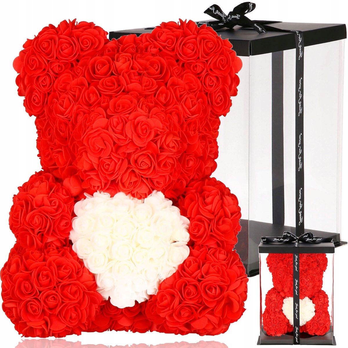 Meškiukas su rožėmis – puiki dovana kiekvienai moteriai. Jis pagamintas iš maždaug 600 rožių, kurios yra išdėstytos mielo meškiuko pavidalu. Kompozicija bus graži bet kokio interjero puošmena. Prie meškiuko pritvirtintos LED lemputės, kurios padarys dekoraciją dar unikalesnę. Rožės niekada nenuvys, todėl dar ilgai primins joms dovanotą nuostabią dieną.