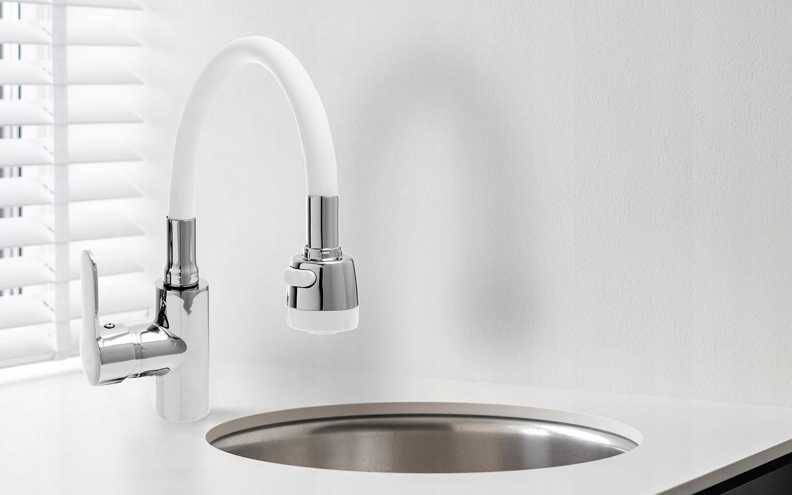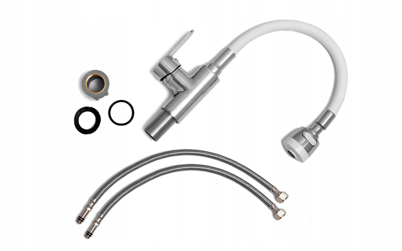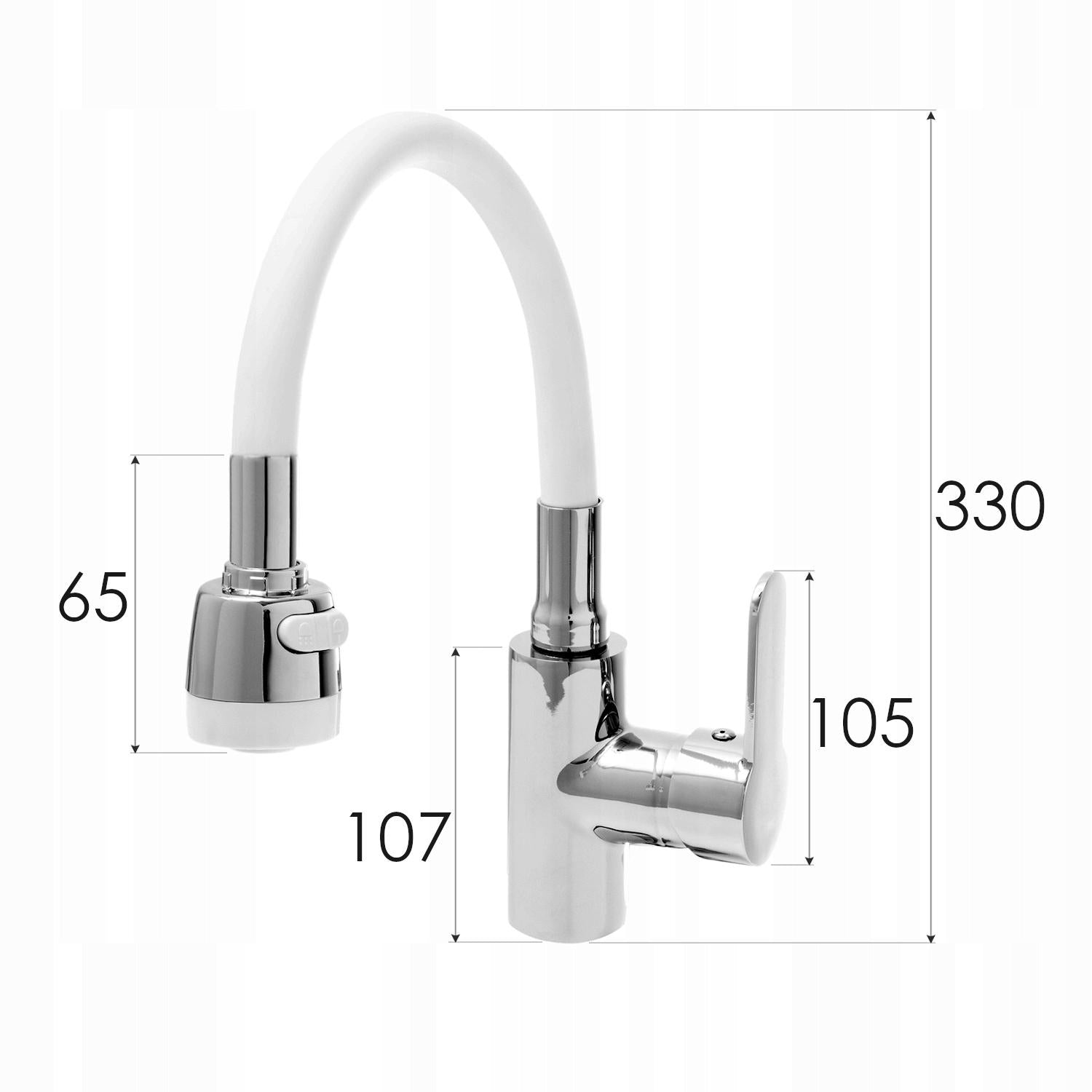 Kriauklės maišytuvas, vienos svirties, stovimas, keraminė galvutė. Turi ilgą, judantį, lankstų balto silikono snapelį. Maišytuvas aprūpintas dviejų srovių antgaliu, kurio dėka galime pakeisti vandens srovę iš klasikinės į difuzinę.  Aeravimo antgalis – aeratorius – sumažina vandens sąnaudas iki 40%. Rinkinį sudaro dvi pintos žarnos (40 cm F 3/8 ") ir visi surinkimui reikalingi elementai.